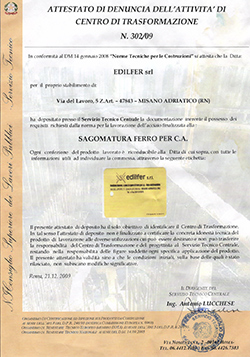 Edilfer possiede anche la Certificazione di saldatura ed è stata riconosciuta dal Servizio Tecnico Centrale come Centro di Trasformazione in possesso di tutti i requisiti richiesti dalla norma per la lavorazione dell’acciaio finalizzata alla sagomatura del ferro per cemento armato.